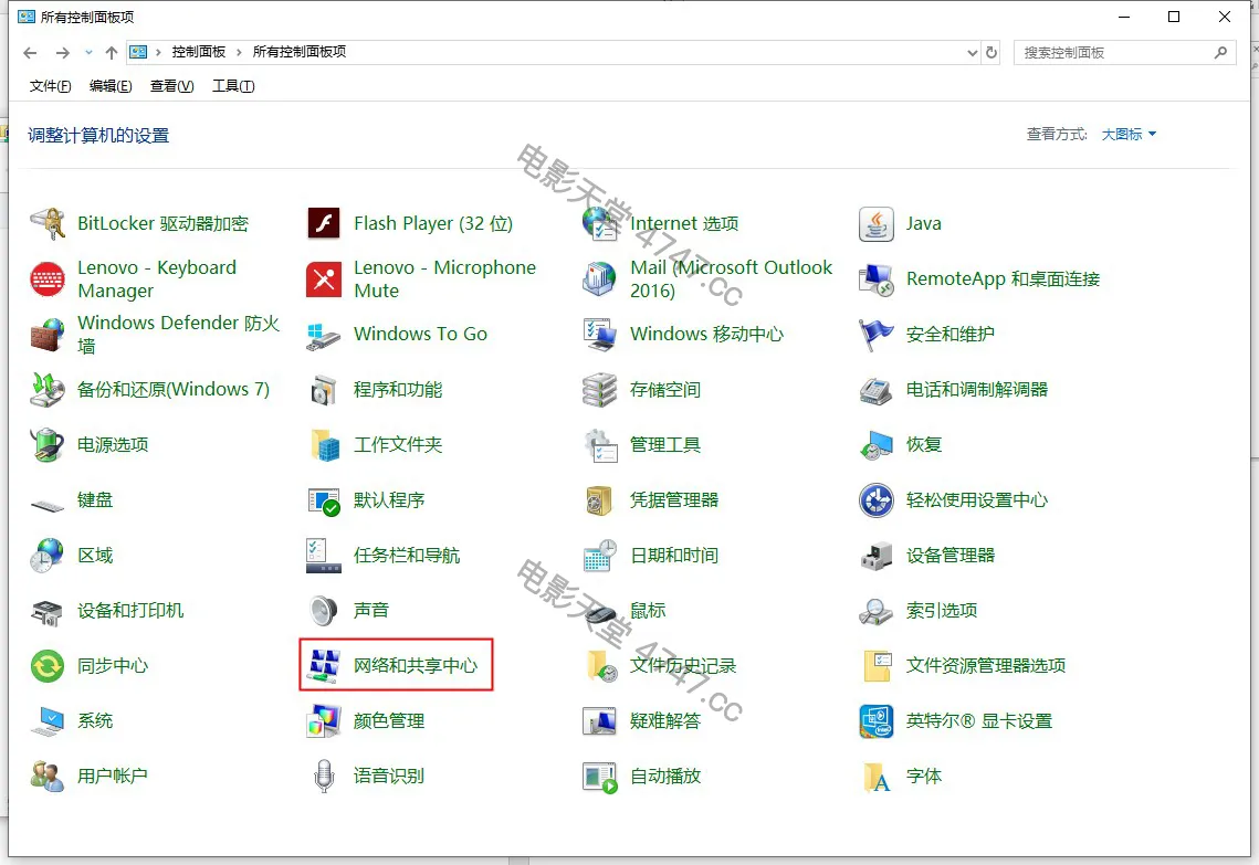 1.打开Windows 10系统控制面板,点击右上角的以图标方式显示,点击“网络和共享中心”选项。
