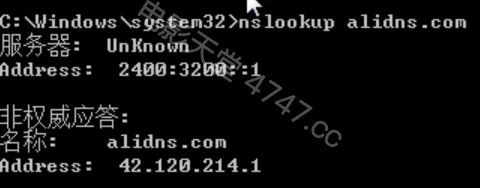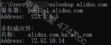 6.验证,打开CMD命令提示符,通过nslookup alidns.com 命令进行验证,若最终解析结果是配置的IPV4公共DNS(223.5.5.5或223.6.6.6)或IPV6公共DNS(2400:3200::1或2400:3200:baba::1)返回的,则说明配置成功。